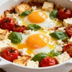This baked feta and egg dish is incredibly versatile. In summer, use heirloom cherry tomatoes and fresh basil; in winter, it’s a bright, comforting meal. You can also prep the vegetable base ahead of time for quicker assembly.