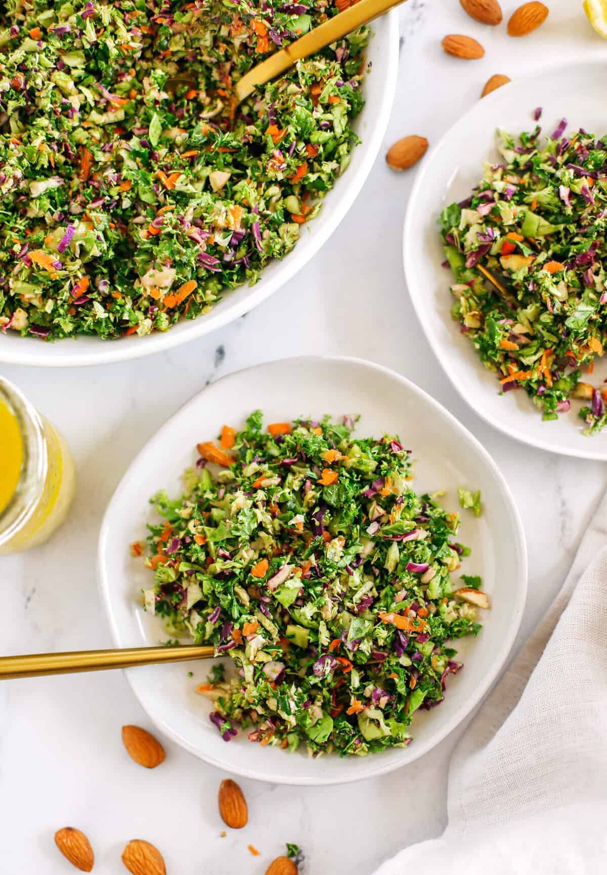 Yes, you can prepare the salad components and dressing separately up to a day in advance. For the best texture, toss the shredded brussels sprouts, broccoli, kale, and cabbage with the lemony ginger dressing just before serving to keep everything crisp.