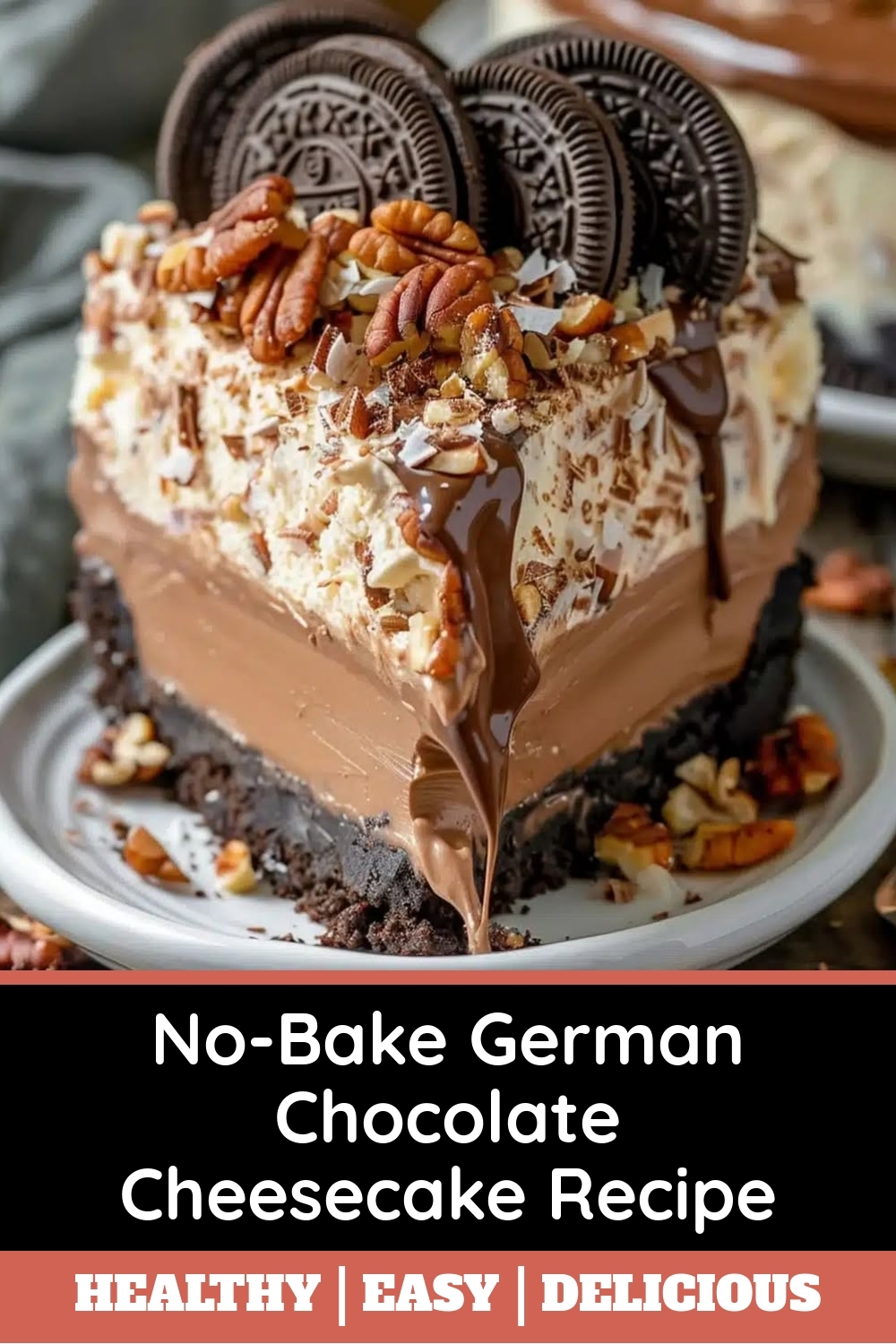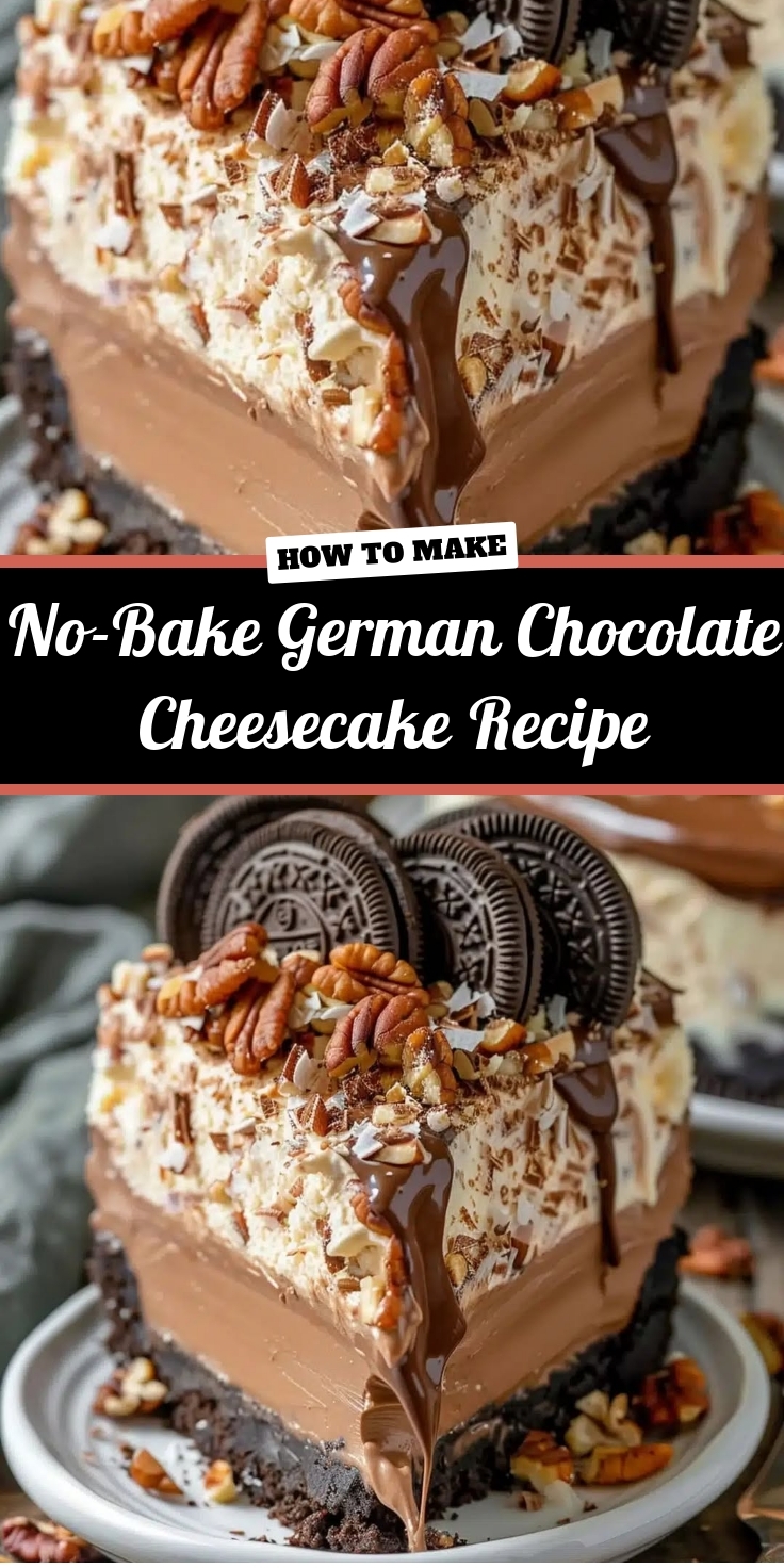 First, grab a medium bowl and mix the crust ingredients—crushed graham crackers, melted butter, and a pinch of salt—until they resemble wet sand. Press this mixture firmly into the bottom of a springform pan, then pop it in the fridge to set while you work on the filling. Meanwhile, beat the cream cheese and sugar in a large bowl until smooth, scraping down the sides as needed. Next, gently fold in the whipped cream to keep the filling light and airy. Stir in the cocoa powder and vanilla for that rich German chocolate flavor. Now, spread half the filling over the chilled crust. Drizzle a generous layer of homemade caramel sauce and sprinkle toasted coconut and pecans over the top. Carefully add the remaining filling, smoothing it with a spatula. Finally, chill the No-Bake German Chocolate Cheesecake Recipe for at least 4 hours, though overnight is even better. For a time-saving hack, use store-bought caramel sauce and pre-toasted nuts if you’re in a rush. Just before serving, garnish with extra coconut, pecans, and a chocolate drizzle for a showstopping finish.