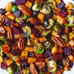 A hearty warm salad featuring roasted Brussels sprouts, sweet potatoes, butternut squash, and beets, topped with crunchy pecans and sweet dried cranberries for a perfect fall or holiday side dish.