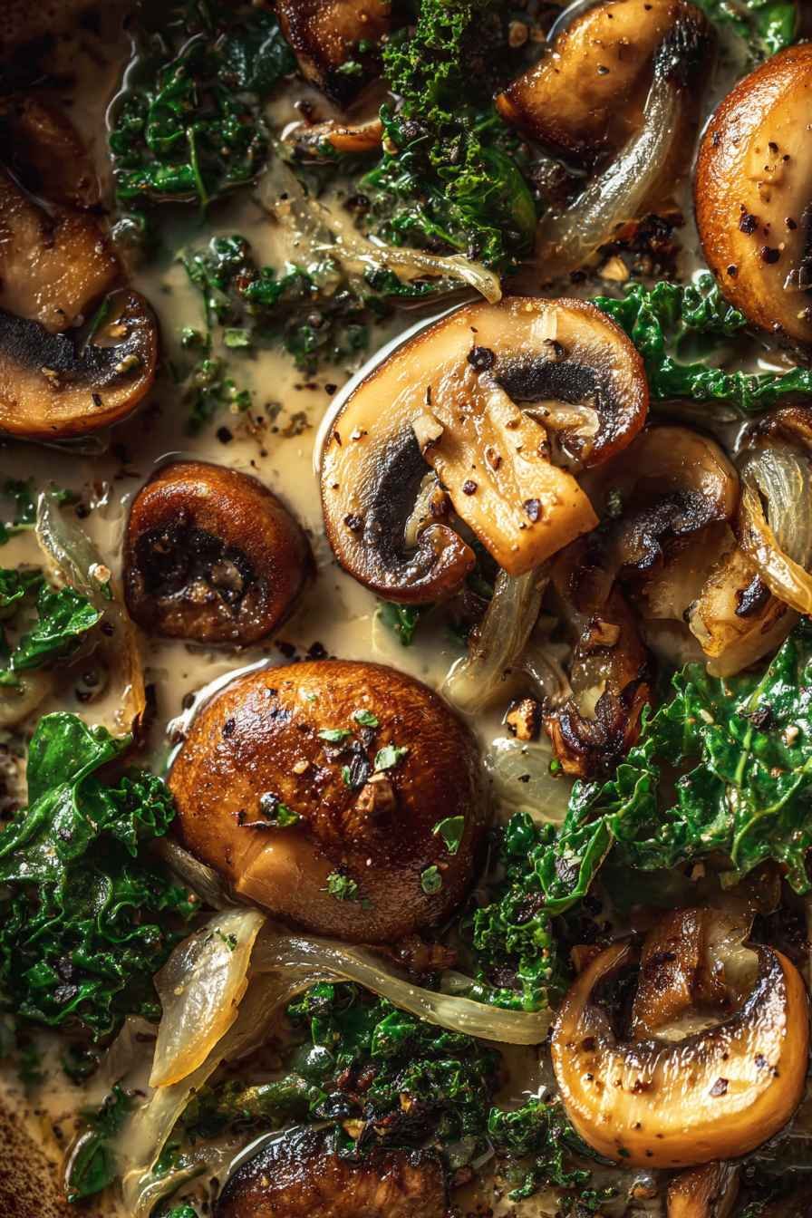 This easy wild mushroom soup with caramelized onions & kale is a deeply flavorful, comforting bowl that feels gourmet but is simple to prepare. The combination of earthy mushrooms, sweet onions, and hearty kale creates a satisfying meal perfect for chilly evenings. For another delicious mushroom dish, try this Creamy Mushroom Chicken Bake Recipe.