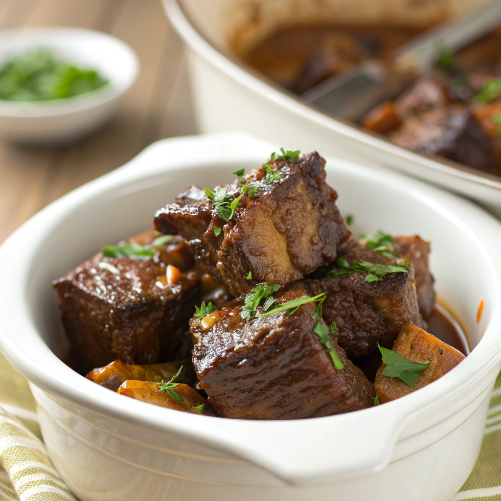 Tender, flavorful short ribs slow-cooked to perfection with a rich sauce made from red wine, beef broth, and aromatic vegetables.