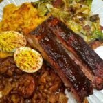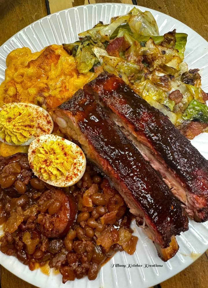 Smoked ribs, baked mac, cowboy beans, fried cabbage and deviled eggs finished