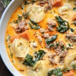 Creamy one-pot soup featuring spicy Italian sausage, sweet potatoes, spinach, garlic, and cheese tortellini in a flavorful broth, ready in 40 minutes with minimal cleanup.