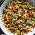 Creamy Spinach and Mushroom Orzo is a quick and easy Italian-inspired pasta dish made in just 30 minutes entirely in one pan. It’s like risotto but simpler. Serve as a meatless main or side dish.