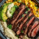This vibrant Steak, Avocado, and Roasted Corn Bowl with Cilantro Cream Sauce combines savory marinated steak, sweet roasted corn, and creamy avocado with a zesty, herbaceous sauce for a truly satisfying meal.