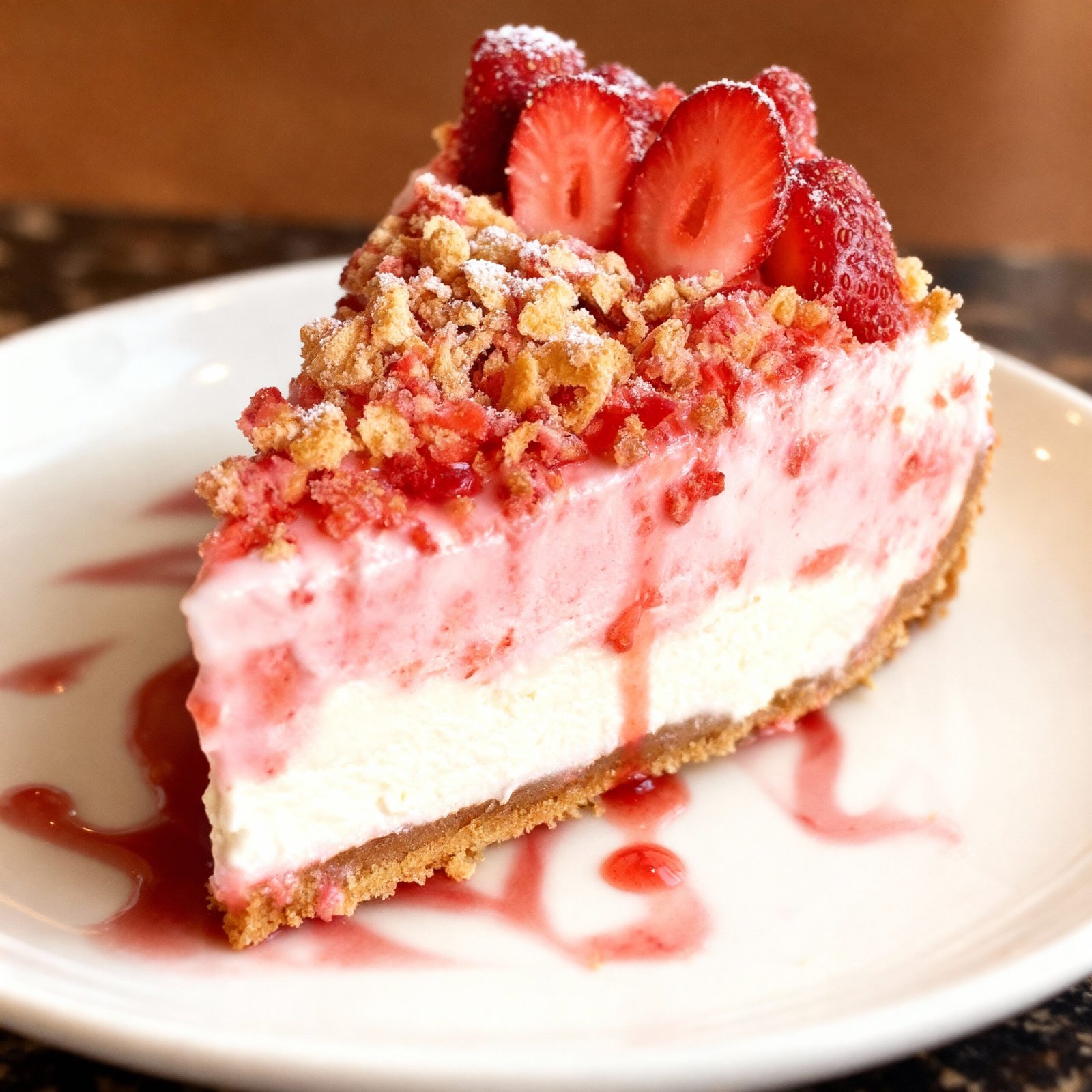 A creamy vanilla cheesecake with a graham cracker crust, topped with a tangy strawberry sauce and finished with a crunchy strawberry shortcake crumble.