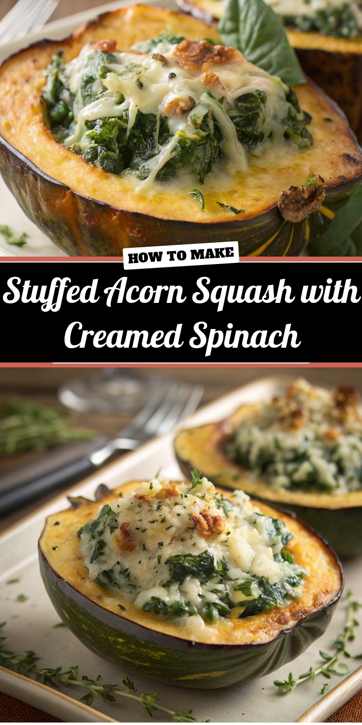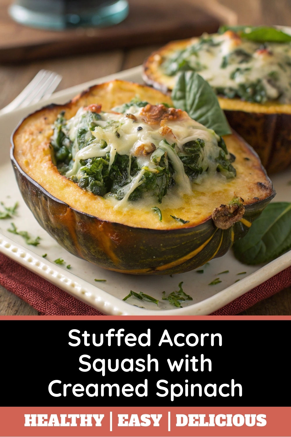 First, preheat your oven to 400°F. Meanwhile, carefully slice each acorn squash in half from stem to base and scoop out the seeds with a sturdy spoon. Next, drizzle the cut sides generously with olive oil and season them well with salt and pepper. Place the halves cut-side down on a parchment-lined baking sheet and roast them for about 30 minutes until they become tender. While the squash roasts, you can start the creamed spinach filling. Sauté a diced onion in a large skillet until it turns translucent, then add your minced garlic and cook for one more minute. Gradually whisk in the heavy cream and a touch of nutmeg, letting the mixture simmer gently. Finally, fold in the fresh spinach and allow it to wilt completely before stirring in the parmesan cheese. Once the squash is ready, flip the halves over and generously fill each cavity with the creamy spinach mixture. For a golden, bubbly finish, return the stuffed squash to the oven for an additional 10 minutes.