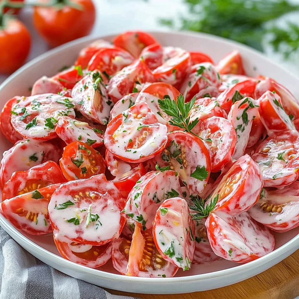 Pour the creamy garlic and dill dressing over the prepared tomatoes in the serving bowl. Using a large spoon or spatula, gently toss to coat every piece evenly. Be gentle to avoid breaking the tomato wedges. For optimal flavor, let the salad sit for 10-15 minutes before serving to allow the ingredients to marry.