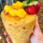 A refreshing tropical smoothie blending fresh strawberries, mango, coconut milk, and chia seeds for a creamy, summer-ready drink packed with vibrant flavors.