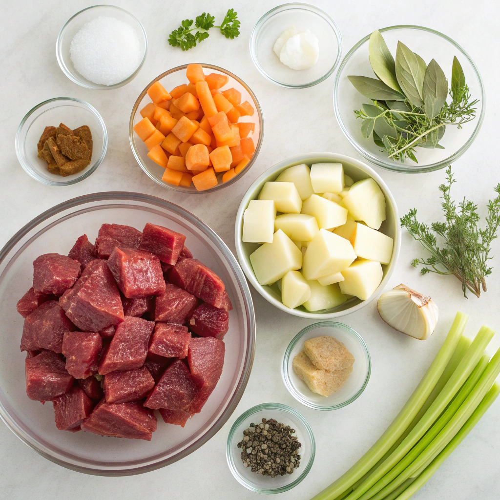 Gather all ingredients for your Witch’s Cauldron Beef Stew: 2 lbs beef chuck (cut into 1-inch cubes), 2 tbsp olive oil, 1 large onion (diced), 3 cloves garlic (minced), 4 carrots (sliced), 3 celery stalks (chopped), 1 lb potatoes (cubed), 4 cups beef broth, 1 cup red wine (optional), 2 tbsp tomato paste, 1 tsp thyme, 1 bay leaf, salt, and pepper. Prepping everything beforehand ensures a smooth cooking process.